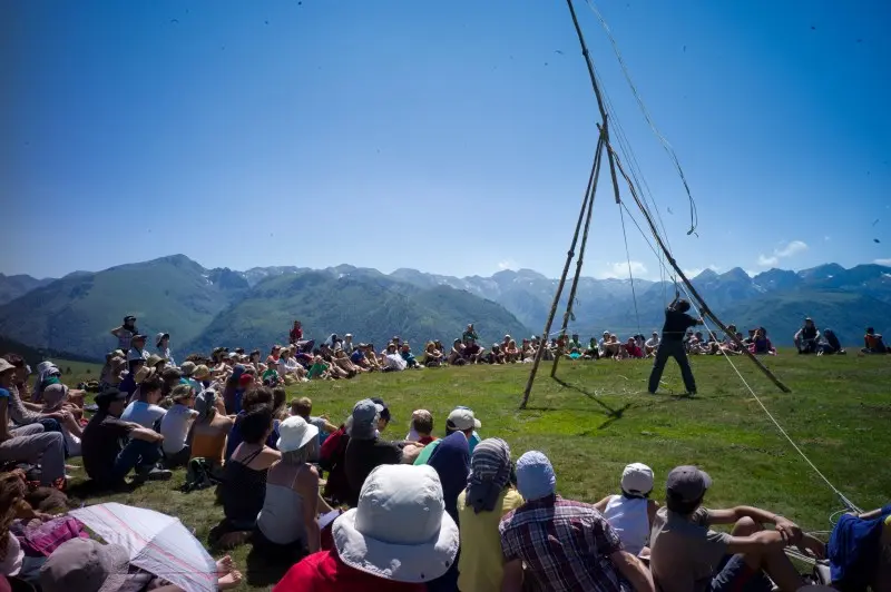 This Catalan artist (...) is a builder of the ephemeral. Throughout the half-hour of Ciel, with a few tree trunks and a set of ropes, he erects a sort of pyramid hut, at the top of which he hoists a final vertical mast by means of a pulley effect. An absolutely useless construction, but beautiful to see assembled, and one that we regret the next day that it has disappeared from the landscape.