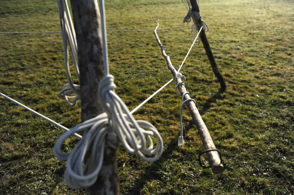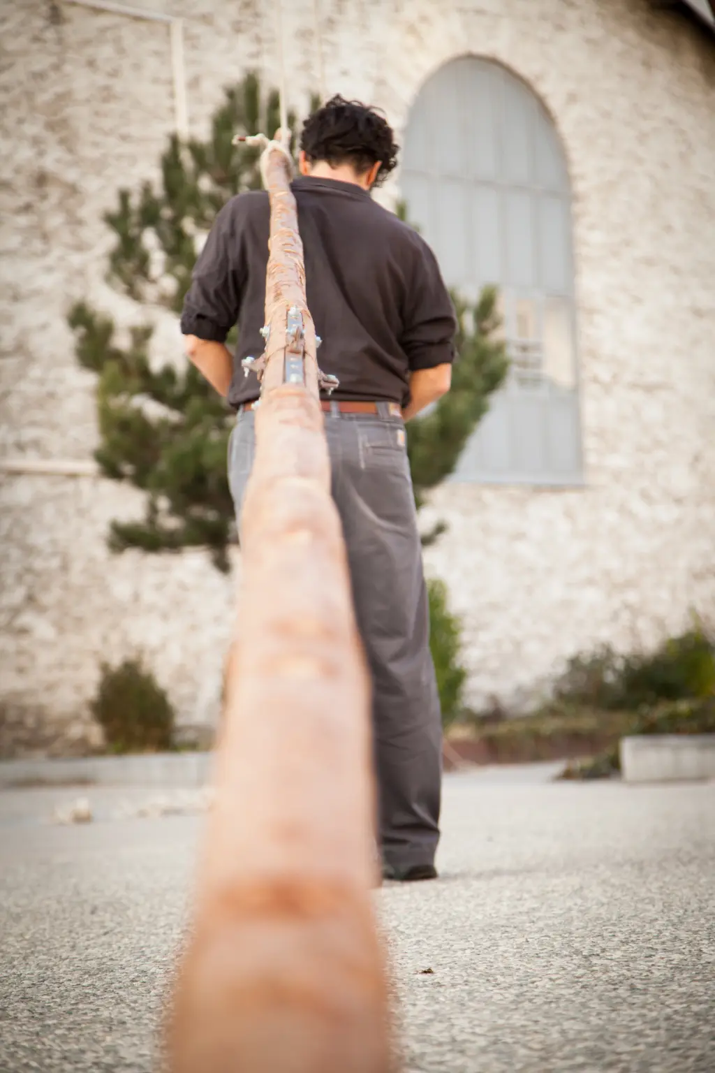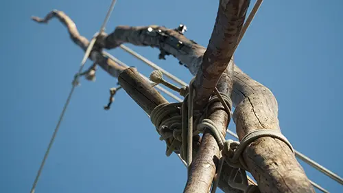 A primitive construction, an arrangement made of tree trunks and some 200 metres of rope, in which the performer's game unfolds towards the heights. This elementary installation can be seen in its assembly process, from the ground to its completion 10 metres above. A syntax made up of simple materials, it tells us the time of the necessary, precise and efficient gesture. It also expresses the time of the curious gaze, the gaze that accepts to follow the narrative of a building gesture, mastered in its quest for balance. It's a kind of fictional architecture that invites the viewer to suspend their gaze, to take a break from the daily grind, to create a poetic gap in the flow of our towns and countryside.