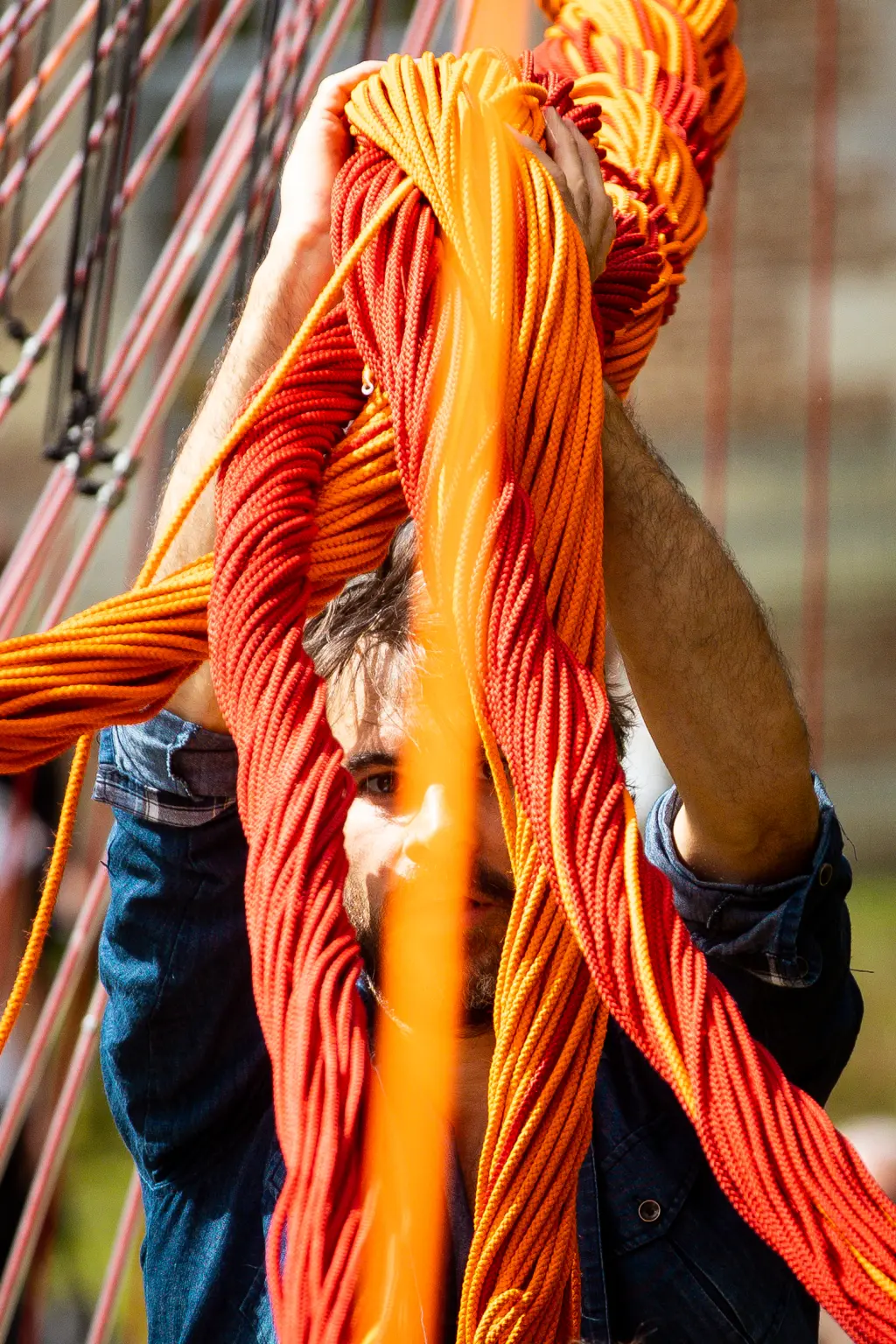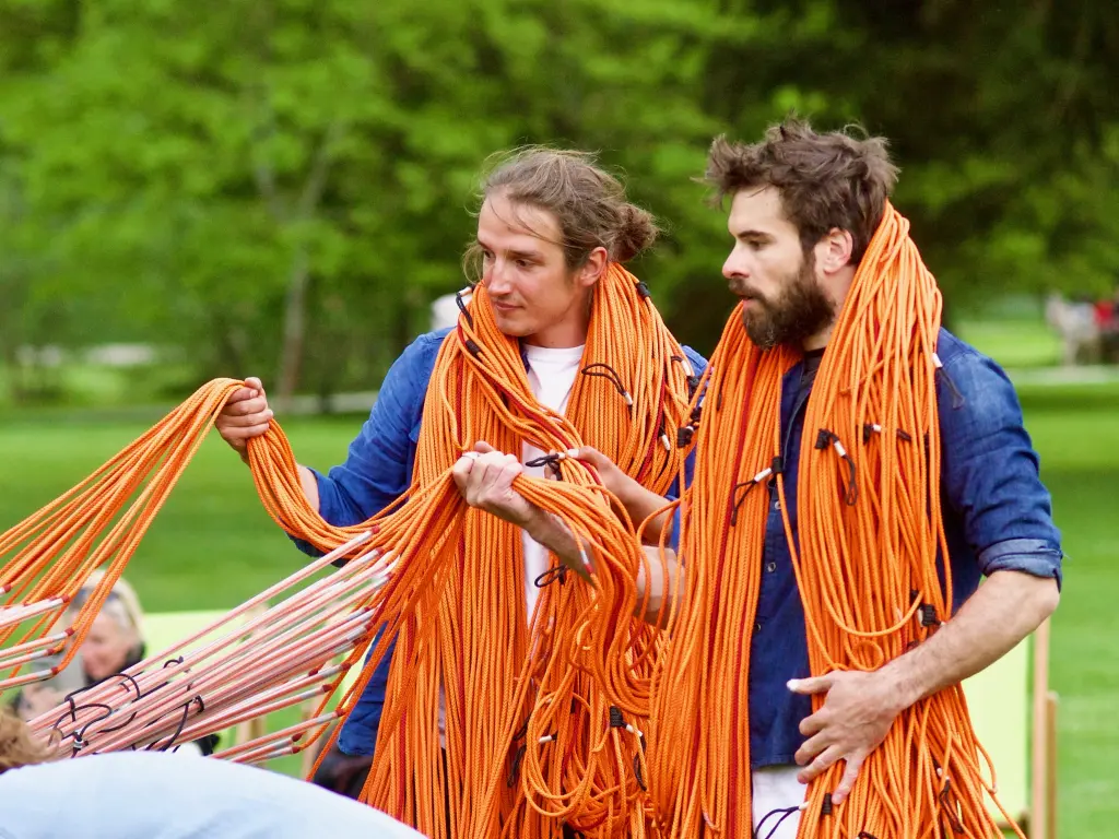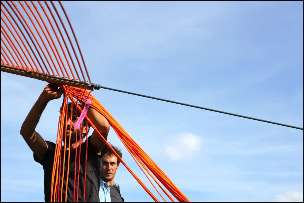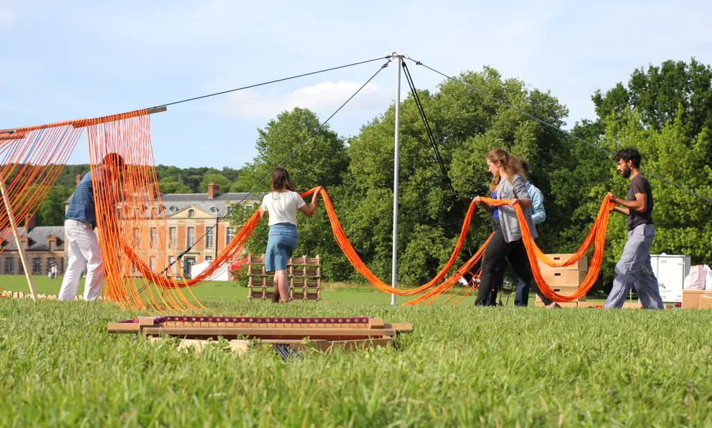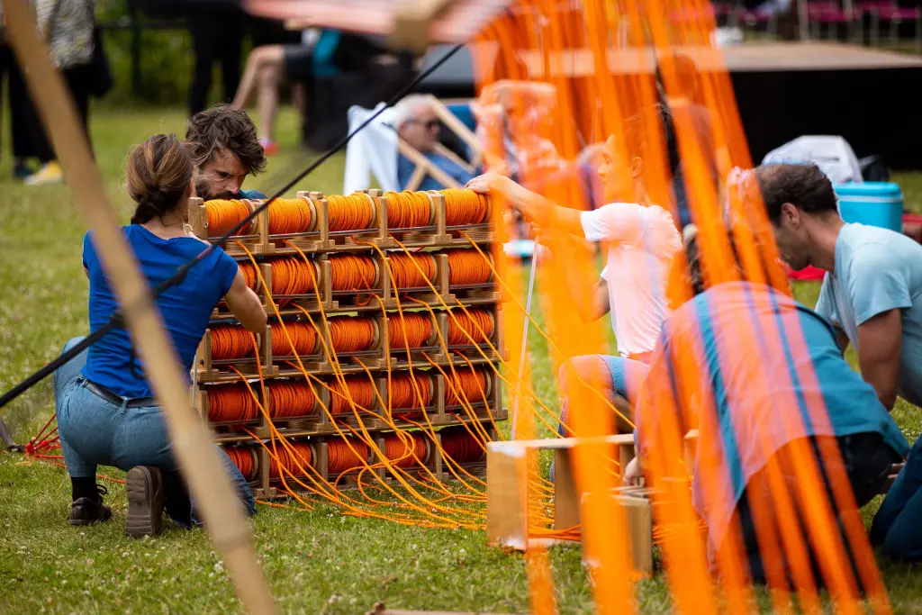 A monumental volume, made up of 8,000 metres of rope meticulously woven and assembled by five performers. From their gestural score - precisely coordinated and articulated around a mast - emerges a place, an ephemeral matrix, an extrapolation. Here, Jordi Galí explores the relationship between the body and the object through the staging of an installation, an improbable architectural construction. Its form appears at the end of the performance, revealing in reverse the meaning and necessity of each gesture produced. As the installation unfolds, spectators will be free to choose their own time frame, to come and go as they please to witness and experience this space in the making.