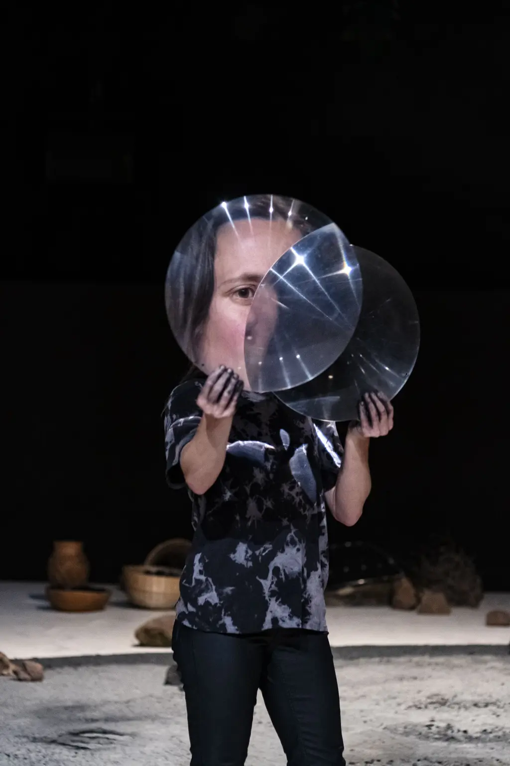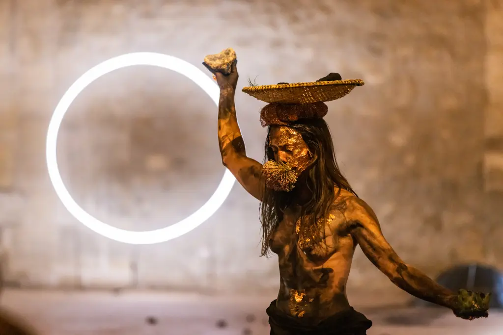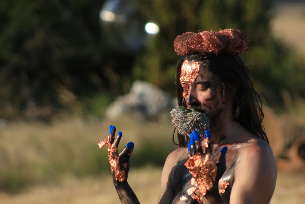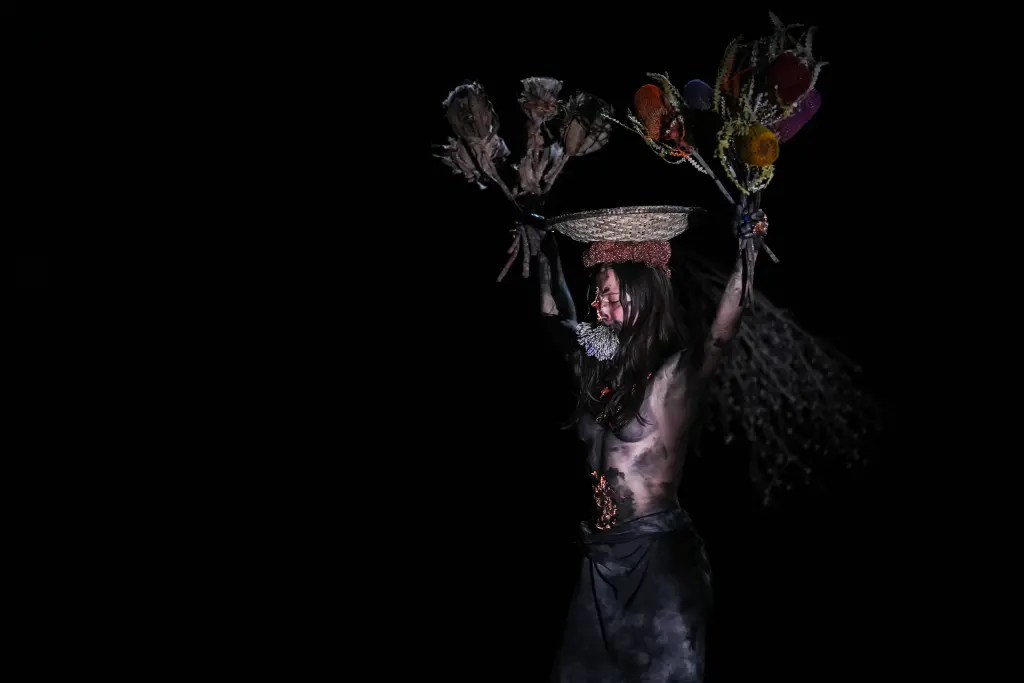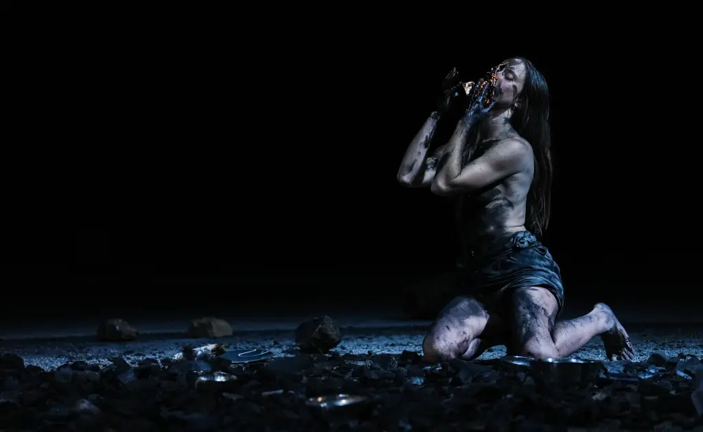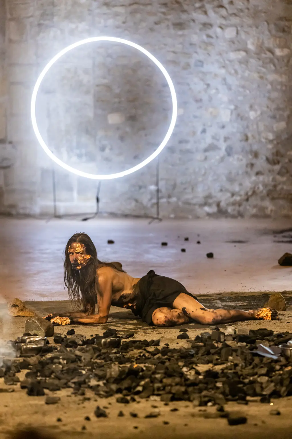 ‘In this solo performance on a charcoal bed, evoking ecological disaster, she manipulates clay and gold during a shamanic ritual to heal a desolate land.’