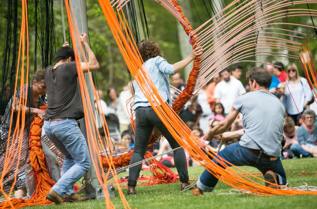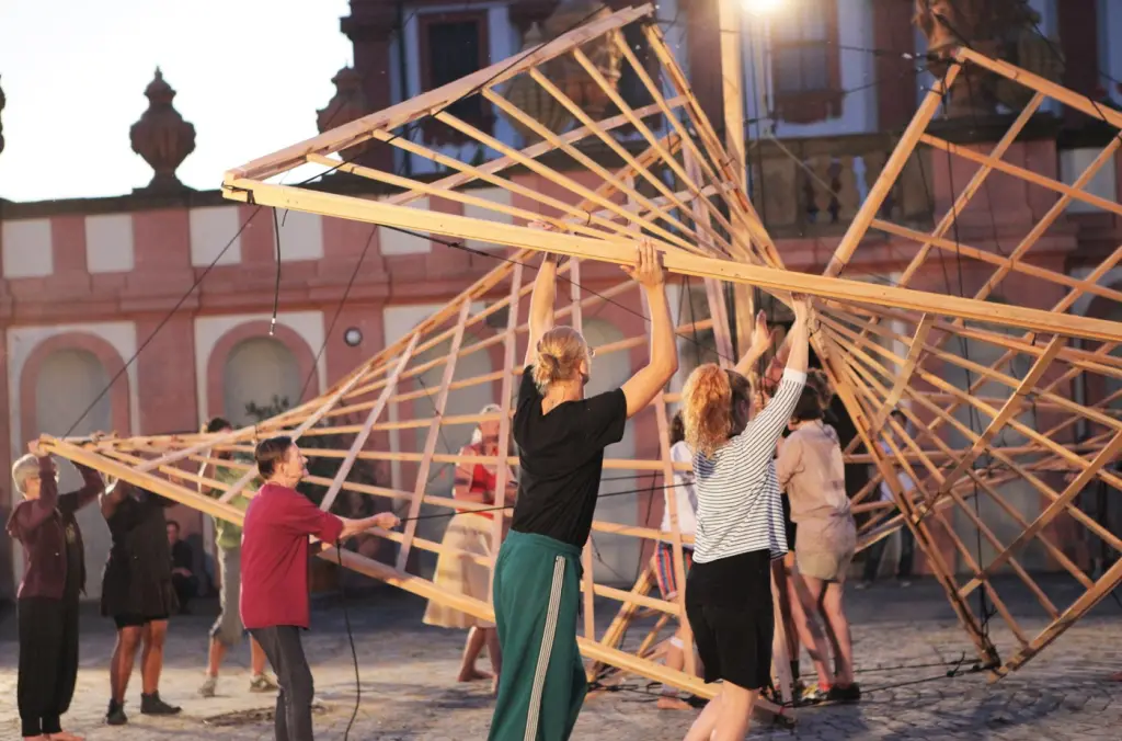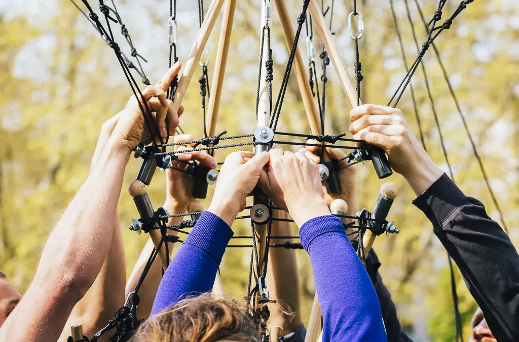 Une construction éphémère en bois et cordage qui fait naitre en complicité un groupe au travail, un geste commun