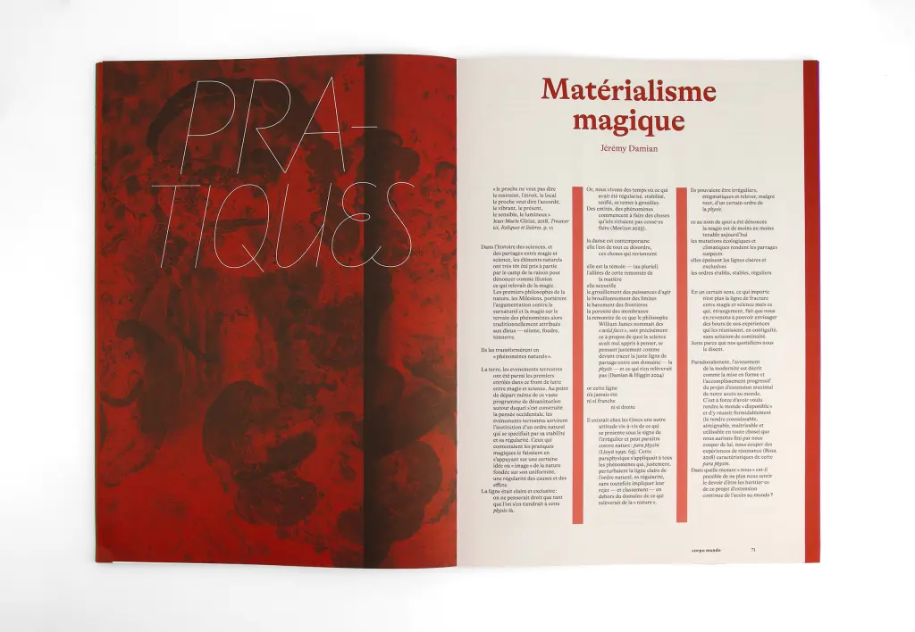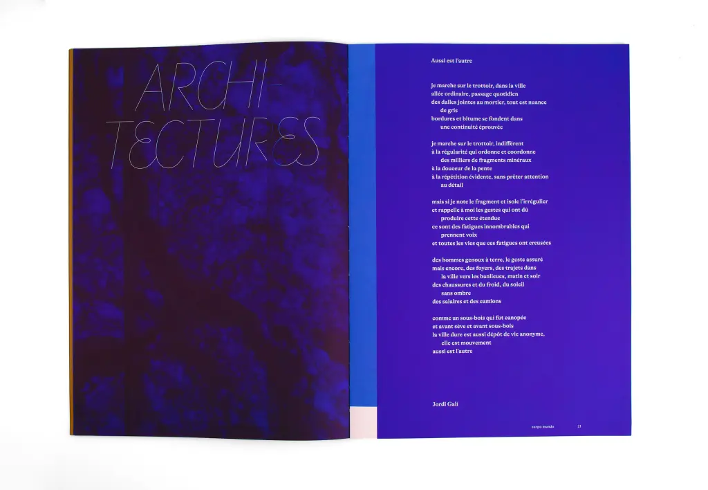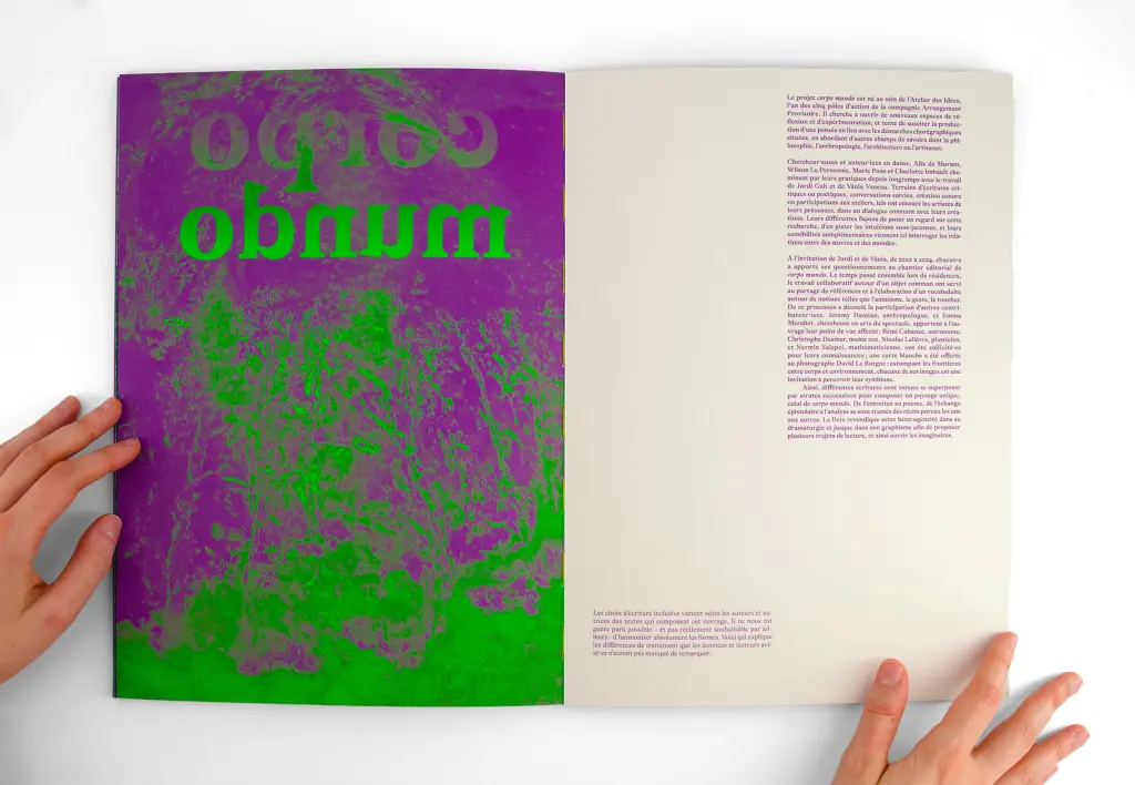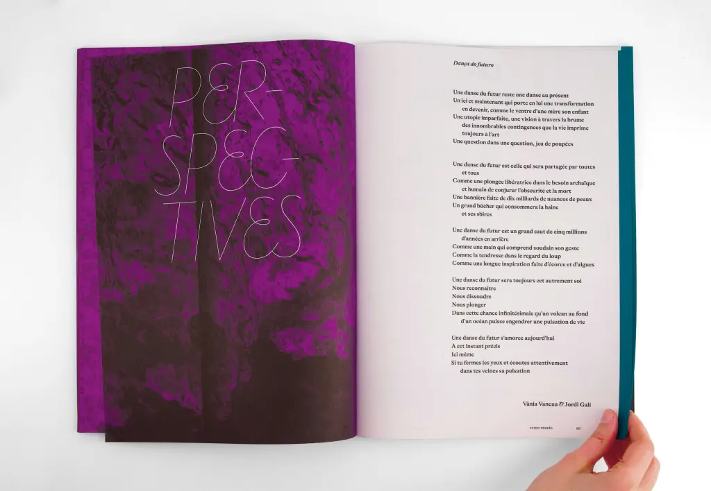 Corpo Mundo – pour corps et matière monde – est unetentative esthétique de compréhension de notre environnement par l’exploration d’écritures et images diverses qui se superposent par strates successives : entretiens, correspondances entre les deux chorégraphes, analyses, poésies, photographies, dessins et suggestions de pratiques artistiques à activer par la.le lecteur.rice. Des récits poreux les uns aux autres qui composent un paysage multiple.
