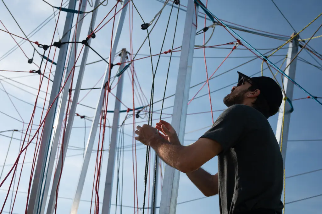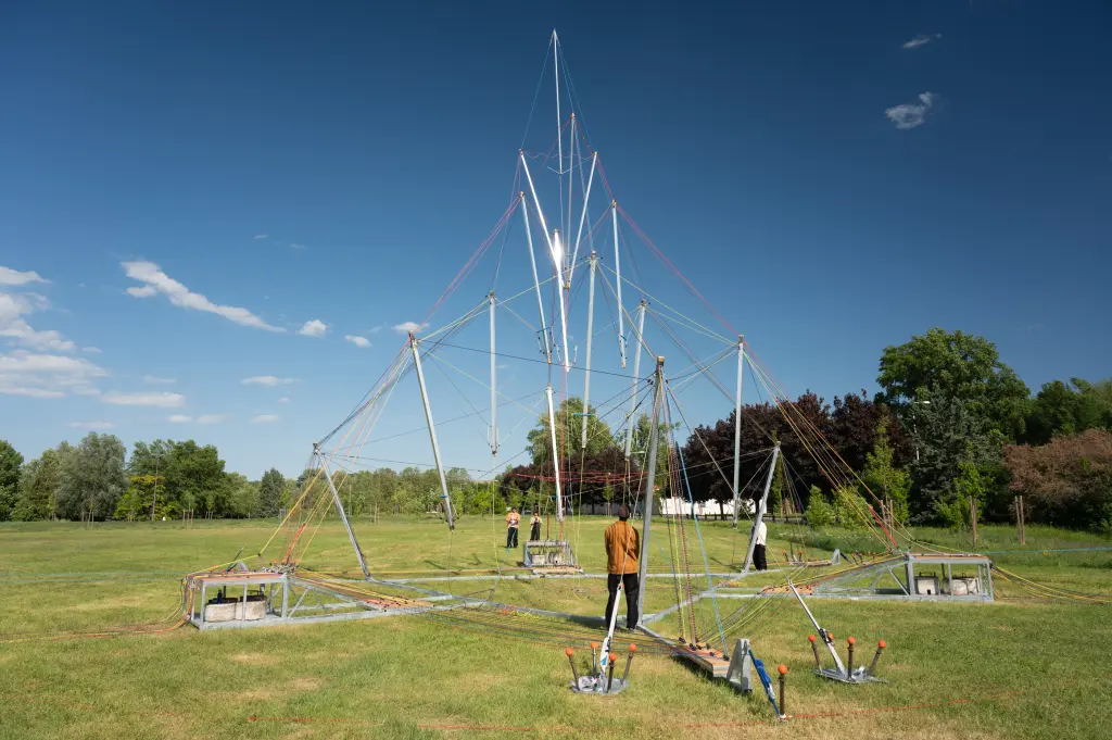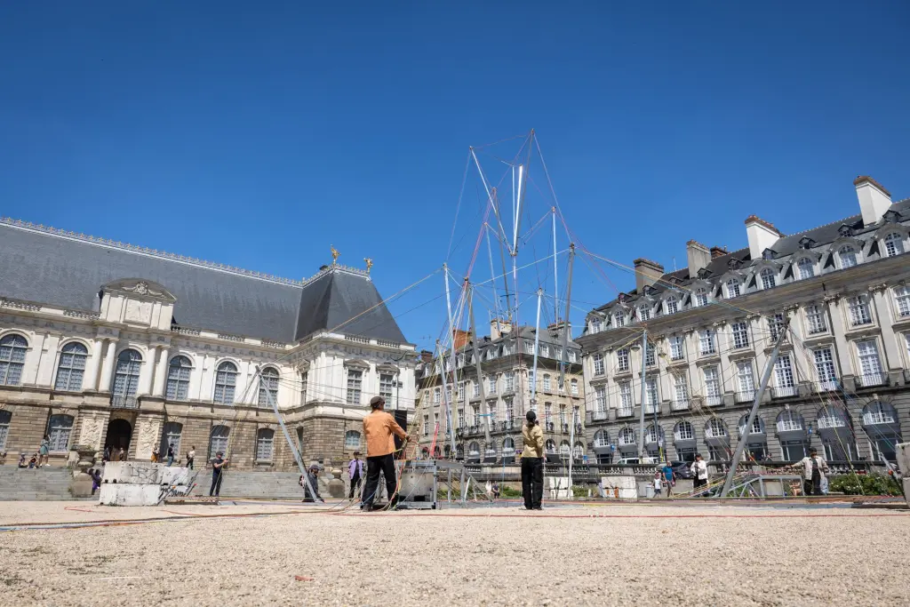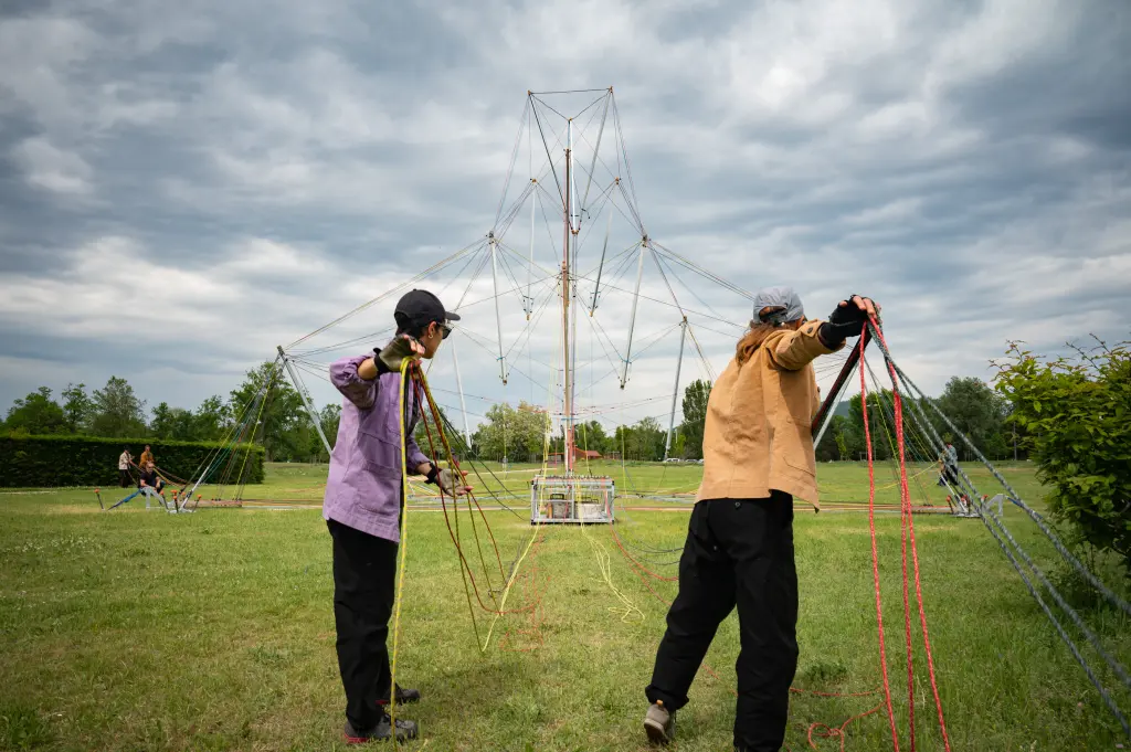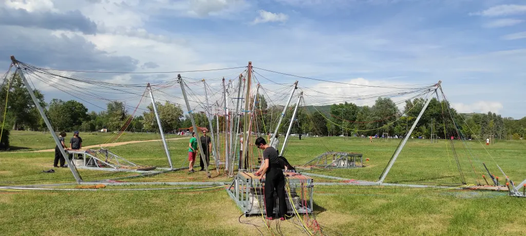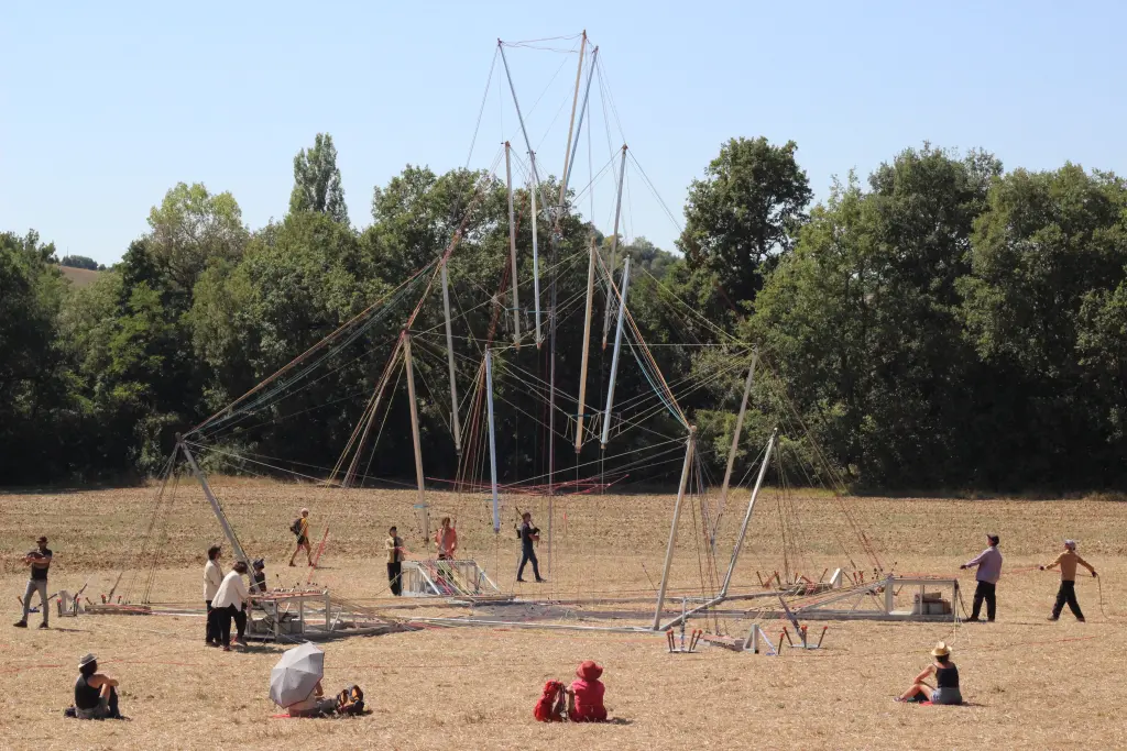 Le latin désigne par anima le souffle, la respiration. Et le rapproche ensuite de l’âme, de l’esprit qui anime les corps. Cette proposition donne à voir le jaillissement d’une forme ramifiée, son apparition et disparition. Les interprèt.e.s, organisé.e.s en cercle autour, viennent progressivement la déployer sur une hauteur de 15m et l’animer. Par le mouvement de l’ensemble, des corps et des matières, le vide entre les parties prend forme et volume.