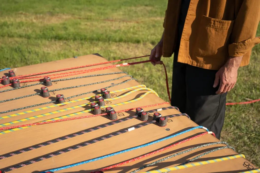 Après dix années de créations sans avoir recours au son, ANIMA est aussi l’occasion d’une nouvelle exploration artistique par la collaboration musicale avec Erwan Keravec, sonneur de cornemuse, compositeur et improvisateur. Il a crée la partition originale, joué live en duo avec Tangui Le Cras, sonneur de biniou. Le dispositif monumental est ici le support dynamique d’une collaboration étroite entre son et geste.