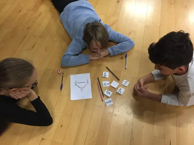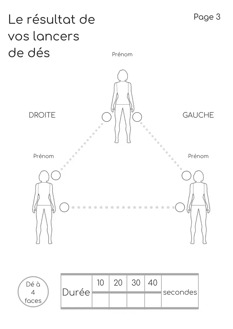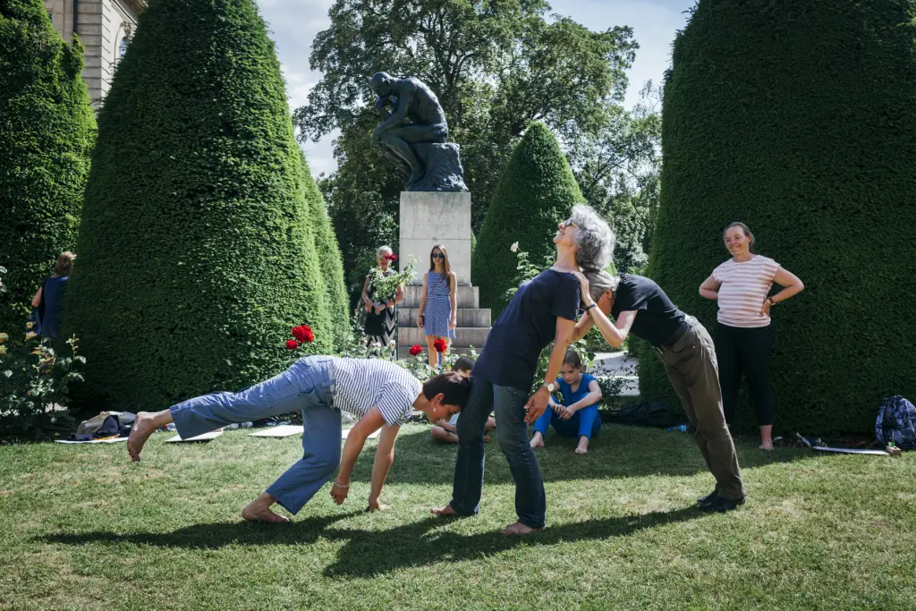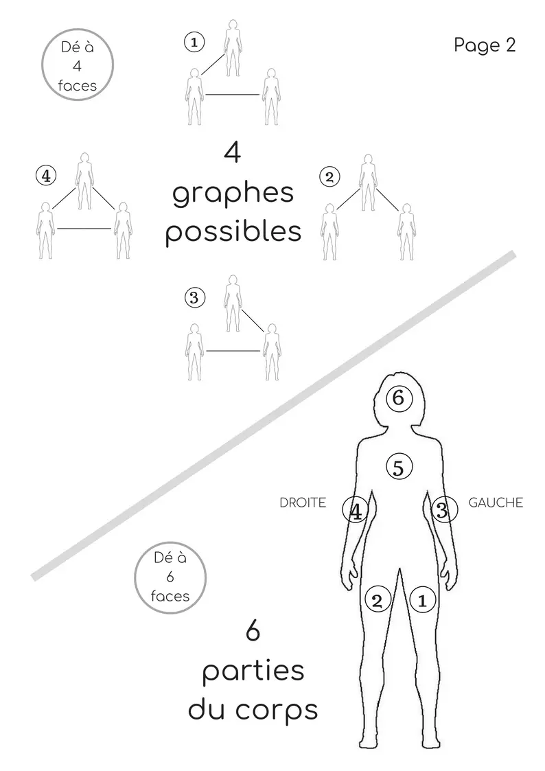 Après un temps d’échauffement les participant.e.s sont réunis en petits groupes pour créer leurs propres structures d’après des paramètres précis : les relations de lien entre les membres du groupe, les parties du corps qui doivent être en contact et le temps qu’ils devront tenir ensemble la structure une fois celle-ci équilibrée. Ces paramètres sont d’abord déterminés par le hasard avec des dés, puis finalement c’est par une exploration empirique des possibles physiques que les structures se forment et se présentent.