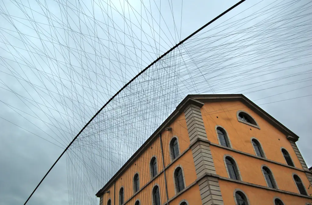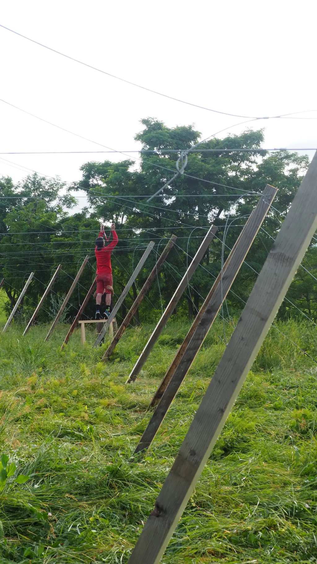 Le site de la Madone de Champdieu est le point de départ de cet abri : un grand pré résultant de décennies d’empilement de déchets végétaux, bordé par les champs et les vignes. Avec au bout du chemin la Madone, point de vue panoramique travaillé par la culture du vin. Une construction éphémère qui utilise un vocabulaire sobre, complice des gestes de la vigne : trois rangées de piquets qui s’allongent sur presque toute la distance du pré ; trois arches douces qui n’existent que par leur accord, par la mise en équilibre des tensions qui les parcourent. Ensemble, ils créent une suspension qui laisse entrevoir la possibilité d’un accueil sommaire, la trame d’un refuge éphémère. Un dedans-dehors qui permet un abri qui n’est autre que celui du paysage.