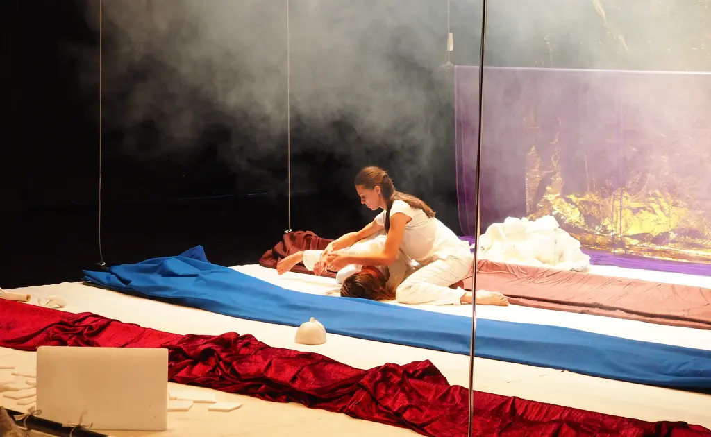 Un jeu de recouvrements et révélations de deux corps dans un paysage changeant. Installation performative cocréé avec Anna Massoni