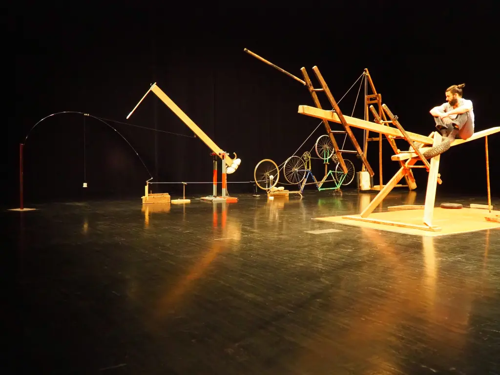 L'instant n'a que nos gestes est une suspension dans le temps. Une exploration poétique faite de gestes simples et tenus. Une parenthèse pour se poser et accompagner l'apparition d'une construction improbable. Une chimère faite de poutres, d'échelles, de pneus... matériaux pauvres qui mettent en jeu le corps qui les travaille.